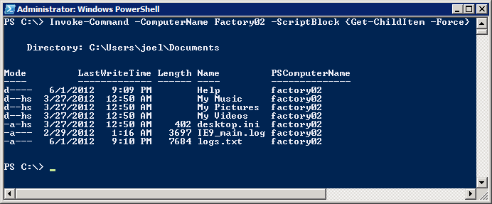 You can see it returned the same directory output that I got while remoted in via Enter-PSSession. However this time it returned the output to my PowerShell console locally. You can see the added column ‘PSComputerName’, identifying which computer it came back from.