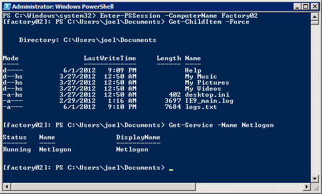 You now have a PowerShell session on the remote system much the same way you have a console session open on your local system. You can utilize all the PowerShell cmdlets and code you know and love. You can see when logged into a remote session your command prompt changes to indicate which system your remoted into and operating on.