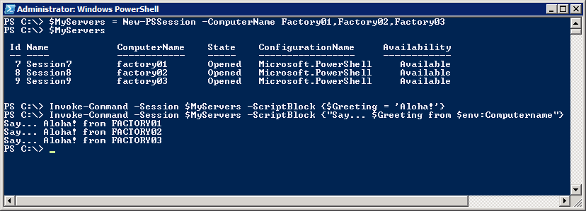The real power of PowerShell Remoting comes into play and is made possible by the New-PSSession cmdlet. The simplest way to use the New-PSSession cmdlet is to feed it some computer names using the ubiquitious -ComputerName parameter. Pass a bundle of your computer names seperated by commas and your good to go. Save the output to a variable and then use that variable with the Invoke-Command -Session parameter. Try using the $Greeting again and you will see what a difference a session makes.